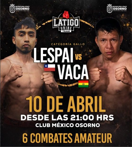 El plato fuerte de la noche será el enfrentamiento en categoría gallo entre el osornino Óscar Lespai y el boliviano Daniel Vaca, actual número uno de su país en dicha división, en un cruce que se asoma como uno de los más exigentes para el representante local.